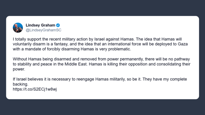 «Io appoggio pienamente l’azione militare recente di Israele contro Hamas. L’idea che Hamas si disarmi volontariamente è una chimera, e quella di una forza internazionale dispiegata a Gaza con il mandato di disarmare con la forza Hamas è assai problematica. Senza il disarmo definitivo di Hamas e la sua rimozione dal potere, non esisterà alcuna via verso stabilità e pace in Medio Oriente. Hamas sta eliminando gli oppositori e consolidando il proprio dominio. Se Israele ritiene necessario riprendere il confronto militare con Hamas, vada pure avanti. Ha il mio appoggio incondizionato».