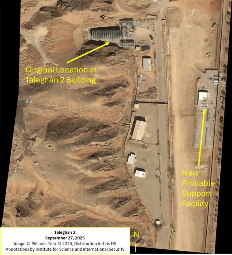 Secondo recenti immagini satellitari analizzate dai ricercatori dell’istituto, tra cui lo stesso Albright, i lavori presso il sito Taleghan sono iniziati a metà maggio 2025 e sono proseguiti per tutta la Guerra dei 12 giorni di giugno, fino a oggi. Il 20 maggio 2025 è stata vista una copertura temporanea nera installata sui resti della struttura distrutta nell’attacco. Il 12 giugno, prima della Guerra dei 12 giorni tra Israele e Iran (che però non ha coinvolto il sito Taleghan) erano stati identificati lavori di movimento terra e di posa delle fondamenta in prossimità della copertura temporanea stessa. Il 30 agosto, una grande struttura a volta (stimata in 45 x 17 metri) risultava costruita sopra la copertura, insieme a due strutture a volta più piccole, ognuna delle quali misura circa 20 x 7 metri. Il 27 settembre, sono stati osservati l’aggiunta di una terza struttura a volta e ulteriori progressi sulle due esistenti. Inoltre, un’ulteriore quarta struttura di supporto è stata individuata a circa 200 metri a est del sito, lungo la strada perimetrale orientale. Quest’ultima struttura è stata osservata per la prima volta a maggio e la sua costruzione è ancora in corso.