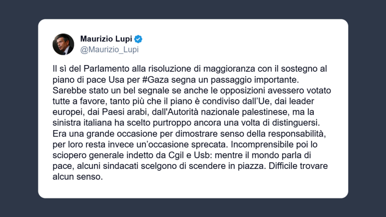 «Incomprensibile poi lo sciopero generale indetto da Cgil e Usb. Mentre il mondo parla di pace, alcuni sindacati scelgono di scendere in piazza. Difficile trovare alcun senso». ha concluso Maurizio Lupi.