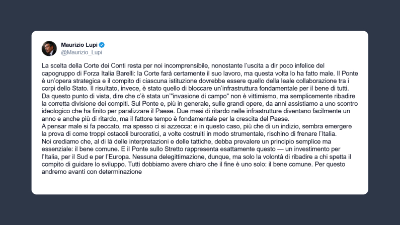 Il segretario di Noi Moderati, Maurizio Lupi, ha scritto su X: «la scelta della Corte dei Conti resta per noi incomprensibile, nonostante l’uscita a dir poco infelice del capogruppo di Forza Italia Barelli: la Corte farà certamente il suo lavoro, ma questa volta lo ha fatto male. Il ponte è un’opera strategica e il compito di ciascuna istituzione dovrebbe essere quello della leale collaborazione tra i corpi dello Stato. Il risultato, invece, è stato quello di bloccare un’infrastruttura fondamentale per il bene di tutti. Da questo punto di vista, dire che c’è stata un’”invasione di campo” non è vittimismo, ma semplicemente ribadire la corretta divisione dei compiti. Sul ponte e, più in generale, sulle grandi opere, da anni assistiamo a uno scontro ideologico che ha finito per paralizzare il Paese. Due mesi di ritardo nelle infrastrutture diventano facilmente un anno e anche più di ritardo, ma il fattore tempo è fondamentale per la crescita del Paese. A pensar male si fa peccato, ma spesso ci si azzecca. E in questo caso, più che di un indizio, sembra emergere la prova di come troppi ostacoli burocratici, a volte costruiti in modo strumentale, rischino di frenare l’Italia. Noi crediamo che, al di là delle interpretazioni e delle tattiche, debba prevalere un principio semplice ma essenziale. Il bene comune. E il Ponte sullo Stretto rappresenta esattamente questo, un investimento per l’Italia, per il sud e per l’Europa. Nessuna delegittimazione, dunque, ma solo la volontà di ribadire a chi spetta il compito di guidare lo sviluppo. Tutti dobbiamo avere chiaro che il fine è uno solo, il bene comune. Per questo andremo avanti con determinazione».
