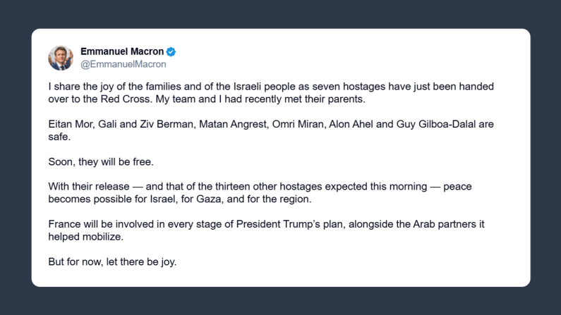 Il presidente francese, Emmanuel Macron, ha scritto su X: «Esprimo la mia gioia insieme alle famiglie e al popolo israeliano per la liberazione di sette ostaggi, appena consegnati alla Croce Rossa: Eitan Mor, Gali Berman, Ziv Berman, Matan Angrest, Omri Miran, Alon Ahel e Guy Gilboa-Dalal sono al sicuro. Presto saranno liberi e con la loro liberazione, insieme a quella degli altri tredici ostaggi attesa questa mattina, la pace diventa possibile per Israele, per Gaza e per l’intera regione».
