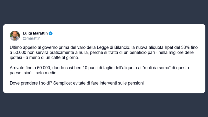 Il segretario nazionale del Partito Liberaldemocratico, Luigi Marattin, ha scritto su X: «Ultimo appello al Governo prima del varo della Legge di Bilancio: la nuova aliquota Irpef del 33% fino a 50 mila non servirà praticamente a nulla, perché si tratta di un beneficio pari – nella migliore delle ipotesi – a meno di un caffè al giorno». Arrivate fino a 60 mila, dice Marattin, dando così «ben 10 punti di taglio dell’aliquota ai “muli da soma” di questo Paese, cioè il ceto medio. Dove prendere i soldi? Semplice – conclude – evitate di fare interventi sulle pensioni».