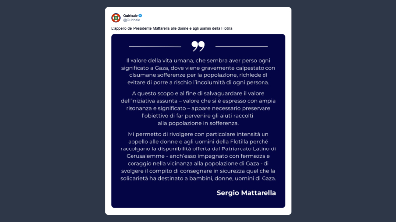 Appello del presidente della Repubblica, Sergio Mattarella, diffuso su X tramite il canale del Quirinale alle donne e agli uomini della Flotilla: