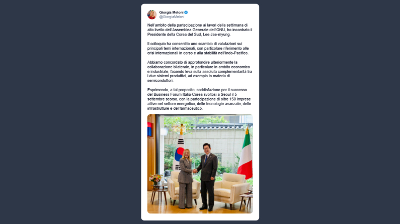 A margine della settimana di alto livello dell’Assemblea generale dell’Onu, il presidente del Consiglio, Giorgia Meloni, ha incontrato il presidente della Corea del Sud, Lee Jae-myung. In un post pubblicato ieri su X, il premier ha evidenziato i temi al centro del colloquio svoltosi ieri, e ha spiegato che sono state trattate le «principali questioni internazionali, con particolare riferimento alle crisi internazionali in corso e alla stabilità nell’Indo-Pacifico». Il confronto ha messo poi in luce l’intenzione di rafforzare la cooperazione bilaterale, soprattutto nei settori economico e industriale. Il capo del Governo ha espresso soddisfazione per il successo del Business Forum Italia-Corea, tenutosi a Seoul il 5 settembre, che ha visto la partecipazione di oltre 150 imprese nei settori energetico, tecnologico, infrastrutturale e farmaceutico.