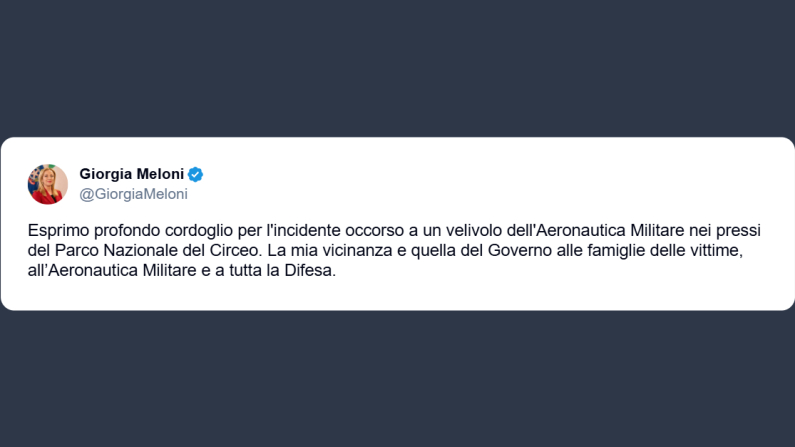 Il presidente del Consiglio, Giorgia Meloni, ha scritto su X: «esprimo profondo cordoglio per l’incidente occorso a un velivolo dell’Aeronautica Militare nei pressi del Parco Nazionale del Circeo. La mia vicinanza e quella del Governo alle famiglie delle vittime, all’Aeronautica Militare e a tutta la Difesa».
