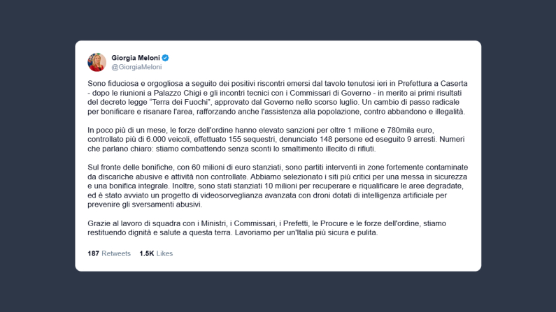 Il presidente del Consiglio, Giorgia Meloni, ha dichiarato ieri su X di essere «fiduciosa e orgogliosa» dei primi risultati del decreto legge “Terra dei Fuochi”, approvato dal Governo a luglio. Un cambio di passo radicale dei «primi risultati» riscontrati nella Prefettura di Caserta, sottolinea la Meloni, per «bonificare e risanare l’area, rafforzando anche l’assistenza alla popolazione, contro abbandono e illegalità». In poco più di un mese, le forze dell’ordine avrebbero elevato sanzioni per oltre «1 milione e 780mila euro, controllato più di 6 mila veicoli, effettuato 155 sequestri, denunciato 148 persone ed eseguito 9 arresti». Per il capo del Governo i numeri parlano chiaro: «stiamo combattendo senza sconti lo smaltimento illecito di rifiuti».