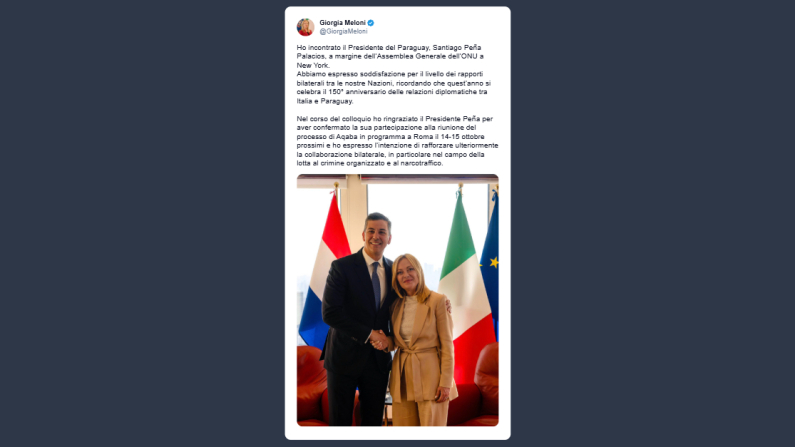 Durante l’Assemblea generale dell’Onu, il presidente del Consiglio, Giorgia Meloni, ha incontrato il presidente del Paraguay, Santiago Peña Palacios. In un post su X, ieri la premier ha espresso soddisfazione per i solidi rapporti bilaterali, nel 150° anniversario delle relazioni diplomatiche tra Italia e Paraguay. «Ho ringraziato il Presidente Peña per aver confermato la sua partecipazione alla riunione del processo di Aqaba in programma a Roma il 14-15 ottobre» scrive il Premier, e ha sottolineato l’impegno a rafforzare la lotta comune contro crimine organizzato e narcotraffico. «Vogliamo intensificare la cooperazione su questi temi».
