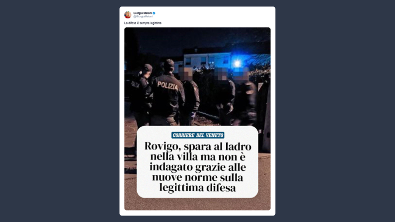 Il presidente del Consiglio, Giorgia Meloni, ha commentato su X un articolo del Corriere del Veneto che riporta la seguente notizia: «Rovigo, spara al ladro nella villa, ma non è indagato grazie alle nuove norme sulla legittima difesa».