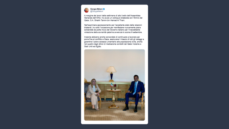 A margine dell’Assemblea Generale dell’Onu, il presidente del Consiglio, Giorgia Meloni, ha annunciato su X il colloquio bilaterale con l’Emiro del Qatar, S.A. Sheikh Tamim bin Hamad Al Thani. «Ho colto l’occasione per manifestare nuovamente piena solidarietà da parte mia e del Governo italiano per l’inaccettabile violazione della sovranità qatarina avvenuta lo scorso 9 settembre». Sì è concordato, ha spiegato la Meloni, di «continuare a lavorare per porre fine al conflitto a Gaza, assicurare il rilascio di tutti gli ostaggi e garantire il pieno accesso umanitario alla popolazione civile, anche nel quadro degli sforzi di mediazione condotti dal Qatar insieme a Stati Uniti ed Egitto».