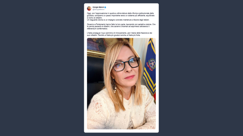 Il presidente del Consiglio, Giorgia Meloni, ha scritto su X: «oggi, con l’approvazione in quarta e ultima lettura della riforma costituzionale della giustizia, compiamo un passo importante verso un sistema più efficiente, equilibrato e vicino ai cittadini. Un traguardo storico e un impegno concreto mantenuto a favore degli italiani. Governo e Parlamento hanno fatto la loro parte, lavorando con serietà e visione. Ora la parola passerà ai cittadini, che saranno chiamati ad esprimersi attraverso il referendum confermativo. L’Italia prosegue il suo cammino di rinnovamento, per il bene della Nazione e dei suoi cittadini. Perché un’Italia più giusta è anche un’Italia più forte».