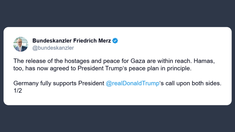 Il primo ministro tedesco Friedrich Merz, ha commentato su l’accettazione di Hamas di una parte del piano di pace: «La liberazione degli ostaggi e la pace per Gaza sono a portata di mano. Anche Hamas ha ora accettato in linea di principio il piano di pace del presidente Donald Trump».