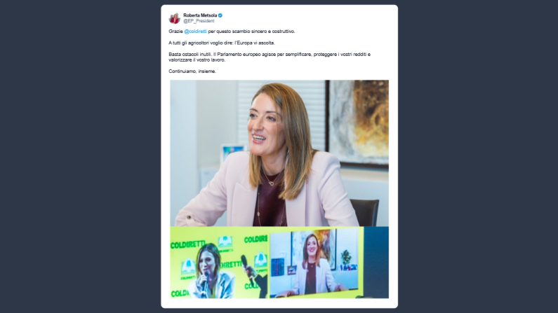 Il presidente del Parlamento europeo, Roberta Metsola, ha scritto su X: «Grazie Coldiretti per questo scambio sincero e costruttivo. A tutti gli agricoltori voglio dire: l’Europa vi ascolta. Basta ostacoli inutili. Il Parlamento europeo agisce per semplificare, proteggere i vostri redditi e valorizzare il vostro lavoro. Continuiamo, insieme».