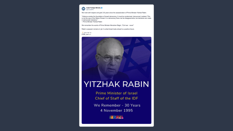 Ministero Esteri israeliano: 30 anni dall’assassinio del primo ministro Yitzhak Rabin