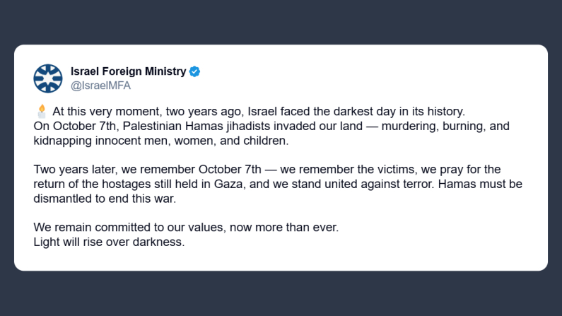 Il ministero degli Esteri israeliano ha scritto su X: «In questo preciso momento, due anni fa, Israele ha vissuto il giorno più buio della sua storia. Il 7 ottobre, gli jihadisti di Hamas hanno invaso il nostro territorio, assassinando, bruciando e rapendo uomini, donne e bambini innocenti». Due anni dopo, dichiara il ministero, «ricordiamo il 7 ottobre: onoriamo le vittime, preghiamo per il ritorno degli ostaggi ancora trattenuti a Gaza e restiamo uniti contro il terrorismo. Hamas deve essere smantellato per porre fine a questa guerra. La luce prevarrà sull’oscurità».