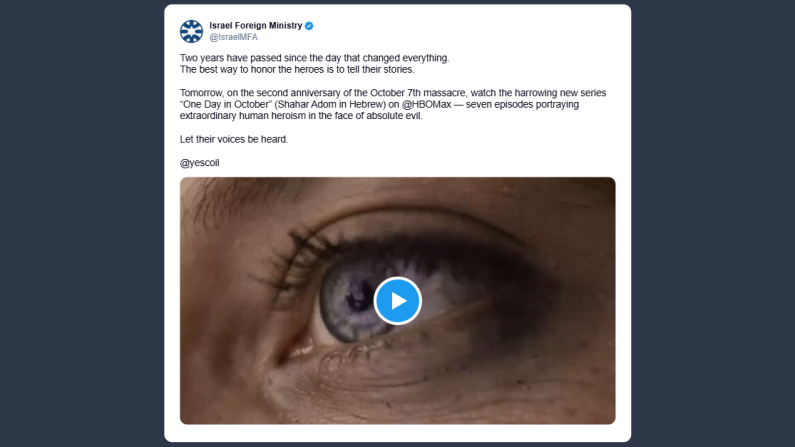 Il ministero degli Esteri israeliano ha scritto su X: «Sono passati due anni da quel giorno che ha cambiato tutto. Il modo migliore per onorare gli eroi è raccontare le loro storie». In occasione del secondo anniversario del massacro del 7 ottobre, il ministero propone la nuova e toccante serie Un giorno in ottobre su Hbo Max: «sette episodi che mettono in luce un eccezionale eroismo umano di fronte al male assoluto. Che le loro voci siano ascoltate».