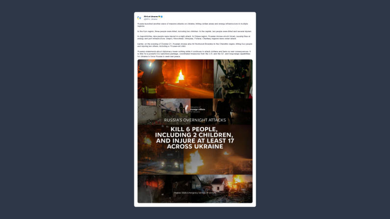 «La Russia ha lanciato una nuova serie di attacchi su vasta scala contro l’Ucraina, colpendo aree civili e infrastrutture energetiche in diverse regioni».