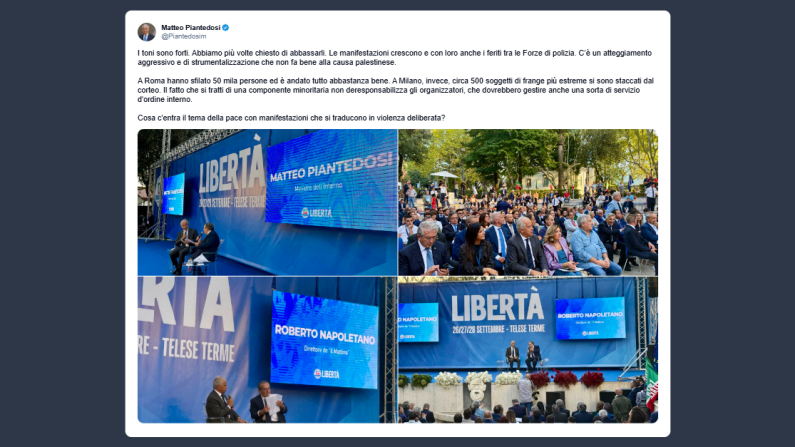 Il ministro dell’Interno, Matteo Piantedosi, con un post su X chiede alla “piazza” di calmarsi: «I toni sono forti. Abbiamo più volte chiesto di abbassarli. Le manifestazioni crescono e con loro anche i feriti tra le Forze di polizia. C’è un atteggiamento aggressivo e di strumentalizzazione che non fa bene alla causa palestinese.