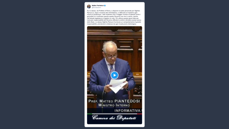 Piantedosi ha poi evidenziato che «chi utilizza questo grave fatto per insinuare responsabilità del Governo offende la verità e dimostra scarso senso dello Stato. Lo stesso Sigfrido Ranucci ha tenuto un comportamento di grande responsabilità, prendendo le distanze da ogni ricostruzione dietrologica».