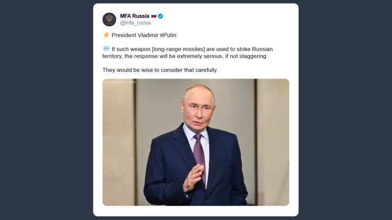 Il ministero degli Esteri russo ha scritto ieri su la seguente dichiarazione del presidente Vladimir Putin: «Se armi come i missili a lungo raggio verranno usate per colpire il territorio russo, la risposta sarà estremamente severa, se non sconvolgente. Farebbero bene a rifletterci con attenzione».