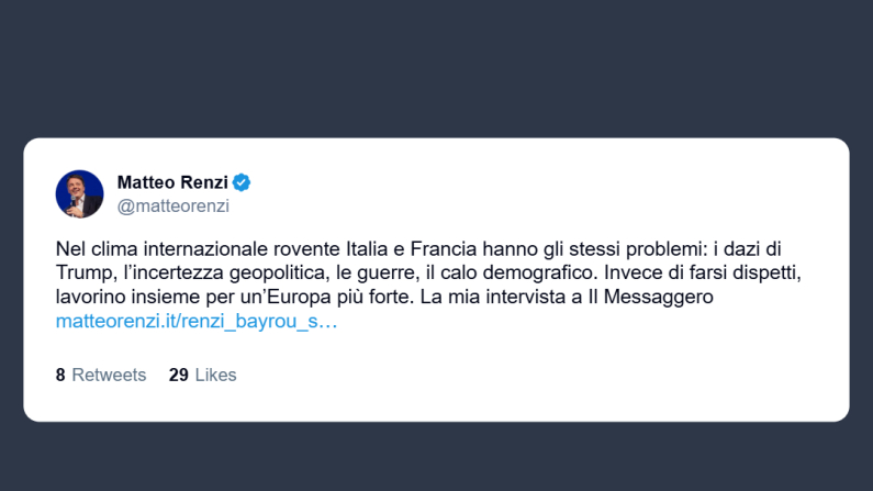 Il presidente di Italia Viva, Matteo Renzi, ha definto in un post su X «rovente» il clima internazionale tra Italia e Francia, che «hanno gli stessi problemi: i dazi di Trump, l’incertezza geopolitica, le guerre, il calo demografico. Invece di farsi dispetti, lavorino insieme per un’Europa più forte».