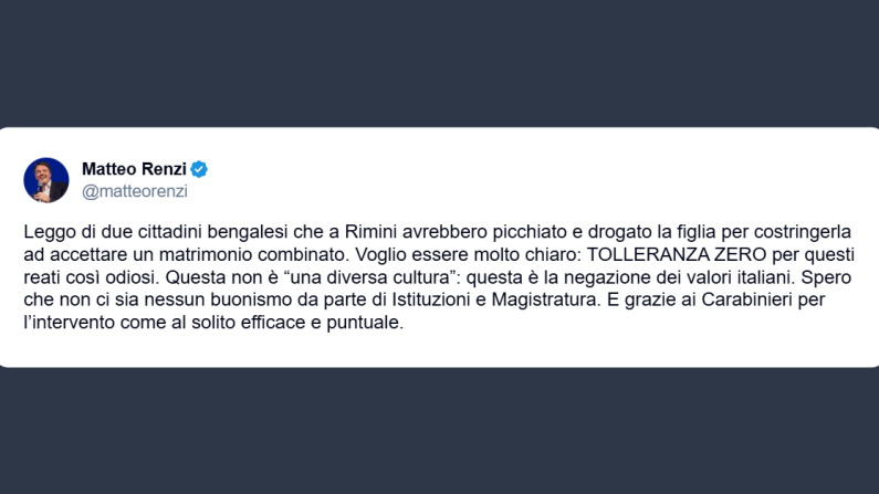 Il segretario di Italia Viva, Matteo Renzi, ha scritto su X: «Leggo di due cittadini bengalesi che a Rimini avrebbero picchiato e drogato la figlia per costringerla ad accettare un matrimonio combinato. Voglio essere molto chiaro: TOLLERANZA ZERO per questi reati così odiosi. Questa non è “una diversa cultura”: questa è la negazione dei valori italiani. Spero che non ci sia nessun buonismo da parte di Istituzioni e Magistratura. E grazie ai Carabinieri per l’intervento come al solito efficace e puntuale».