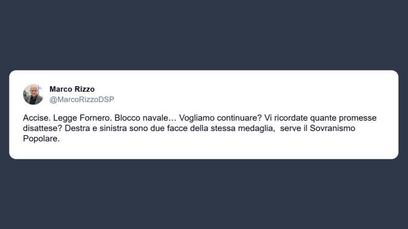 «Accise. Legge Fornero. Blocco navale… Vogliamo continuare? Vi ricordate quante promesse disattese? Destra e sinistra sono due facce della stessa medaglia, serve il Sovranismo Popolare».