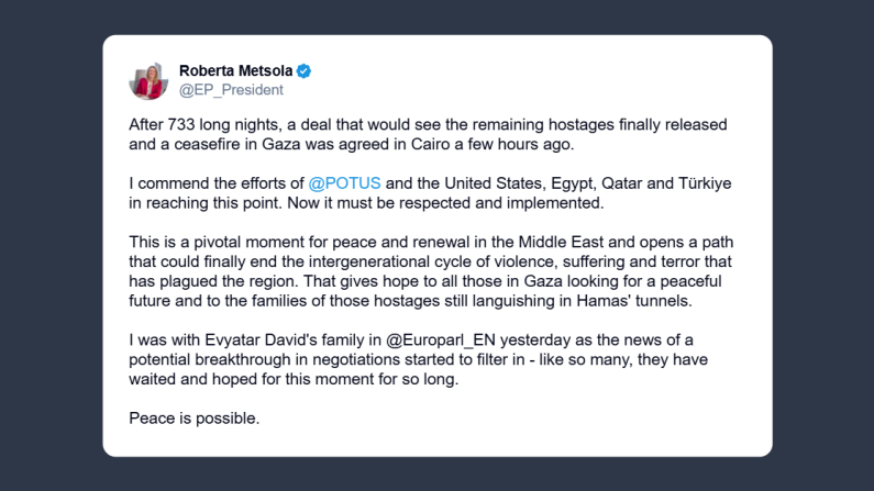 Il presidente del Parlamento europeo, Roberta Metsola, ha così commentato oggi su X l’accordo raggiunto fra Hamas e Israele: