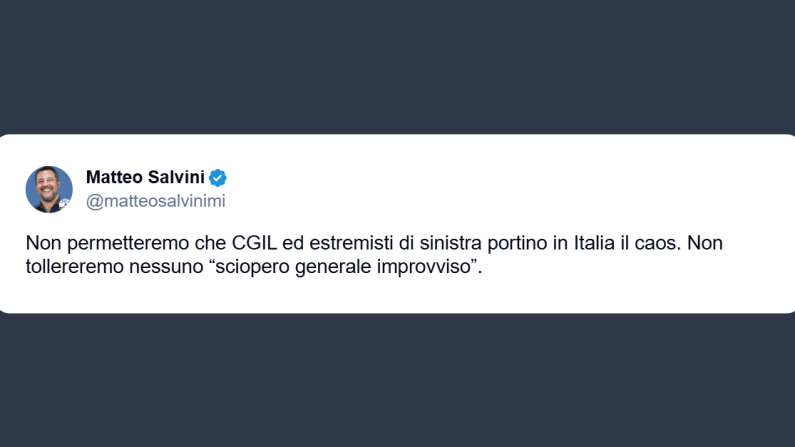 Il leader della Lega, Matteo Salvini, ha così avvisato su X chiunque voglia “cavalcare l’onda dell’indignazione” in Italia: «Non permetteremo che Cgil ed estremisti di sinistra portino in Italia il caos. Non tollereremo nessuno “sciopero generale improvviso”».