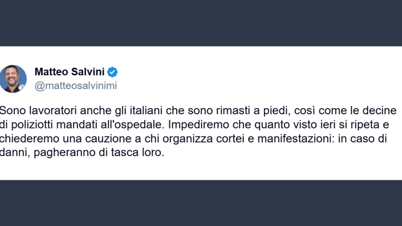 Il ministro dei Trasporti, Matteo Salvini, ha commentato su X la preoccupante situazione delle manifestazioni di ieri. «Sono lavoratori anche gli italiani che sono rimasti a piedi, così come le decine di poliziotti mandati all’ospedale», ha sottolineato Salvini. «Impediremo che quanto visto ieri si ripeta e chiederemo una cauzione a chi organizza cortei e manifestazioni: in caso di danni, pagheranno di tasca loro».