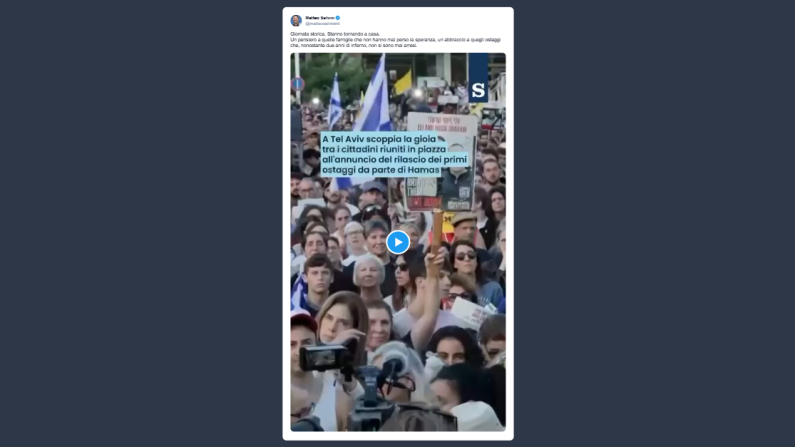 Il segretario della Lega, Matteo Salvini, ha scritto su X: «Giornata storica. Stanno tornando a casa», in riferimento al rilascio degli ostaggi a Gaza, in accordo con il piano di Trump. «Un pensiero a quelle famiglie che non hanno mai perso la speranza, un abbraccio a quegli ostaggi che, nonostante due anni di inferno, non si sono mai arresi».