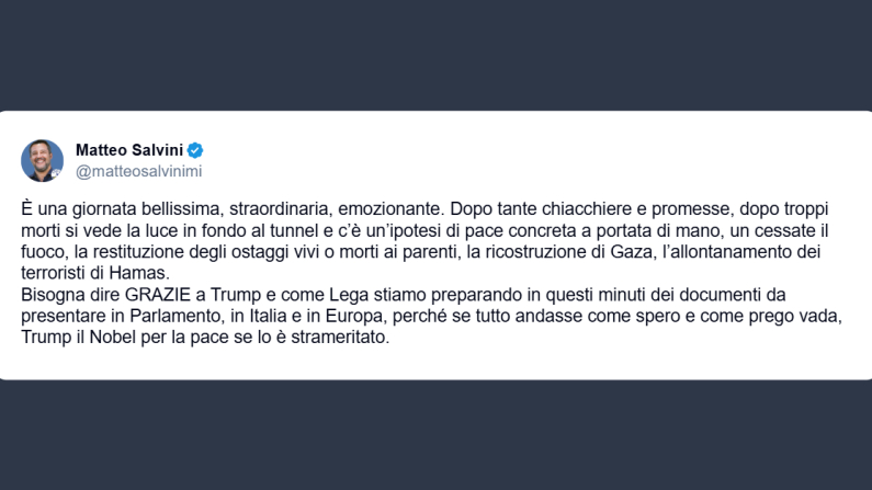 Il segretario della Lega, Matteo Salvini, ha scritto su X: «È una giornata bellissima, straordinaria, emozionante. Dopo tante chiacchiere e promesse, dopo troppi morti si vede la luce in fondo al tunnel e c’è un’ipotesi di pace concreta a portata di mano, un cessate il fuoco, la restituzione degli ostaggi vivi o morti ai parenti, la ricostruzione di Gaza, l’allontanamento dei terroristi di Hamas». Bisogna dire grazie a Trump, dice Salvini, e come Lega «stiamo preparando in questi minuti dei documenti da presentare in Parlamento, in Italia e in Europa, perché se tutto andasse come spero e come prego vada, Trump il Nobel per la pace se lo è strameritato».