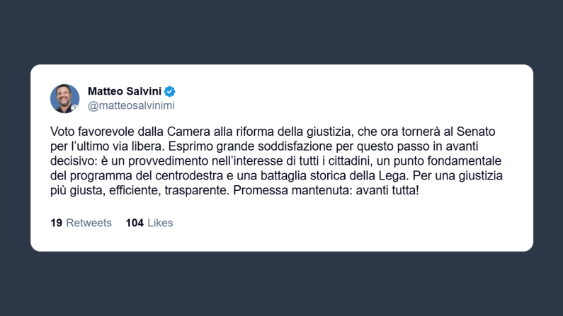 «Voto favorevole dalla Camera alla riforma della giustizia, che ora tornerà al Senato per l’ultimo via libera». Lo ha dichiarato il ministro dei Trasporti, Matteo Salvini, in un post su X. «Esprimo grande soddisfazione per questo passo in avanti decisivo» dato che, ha dichiarato Salvini, è un «provvedimento nell’interesse di tutti i cittadini, un punto fondamentale del programma del centrodestra. Per una giustizia più giusta, efficiente, trasparente».