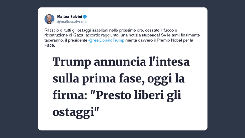 Il segretario federale della Lega, Matteo Salvini, ha scritto su X: «Rilascio di tutti gli ostaggi israeliani nelle prossime ore, cessate il fuoco e ricostruzione di Gaza: accordo raggiunto, una notizia stupenda! Se le armi finalmente taceranno, il presidente Donald Trump merita davvero il Premio Nobel per la Pace».
