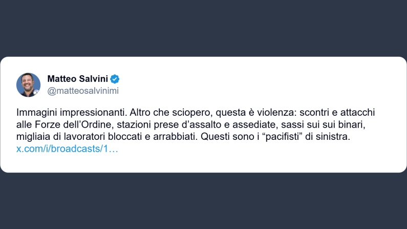 «Altro che sciopero, questa è violenza: scontri e attacchi alle Forze dell’Ordine, stazioni prese d’assalto e assediate, sassi sui binari, migliaia di lavoratori bloccati e arrabbiati». Lo ha dichiarato il ministro dei Trasporti, Matteo Salvini, in un post su X. «Questi sono i “pacifisti” di sinistra», ha conlcuso Salvini.