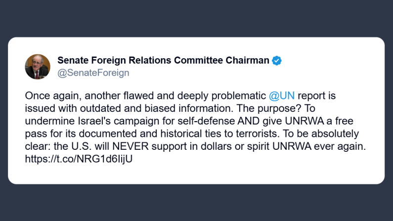 «Ancora una volta, l’Onu ha pubblicato un rapporto viziato e gravemente problematico, basato su informazioni obsolete e faziose. L’obiettivo? Minare la campagna di autodifesa di Israele e scagionare l’agenzia delle Nazioni Unite per il soccorso e l’occupazione dei rifugiati palestinesi nel vicino oriente (Unrwa), nonostante i suoi legami storici e documentati con organizzazioni terroristiche. Che sia assolutamente chiaro: gli Stati Uniti non sosterranno mai più l’Unrwa, né con finanziamenti né con appoggi politici».