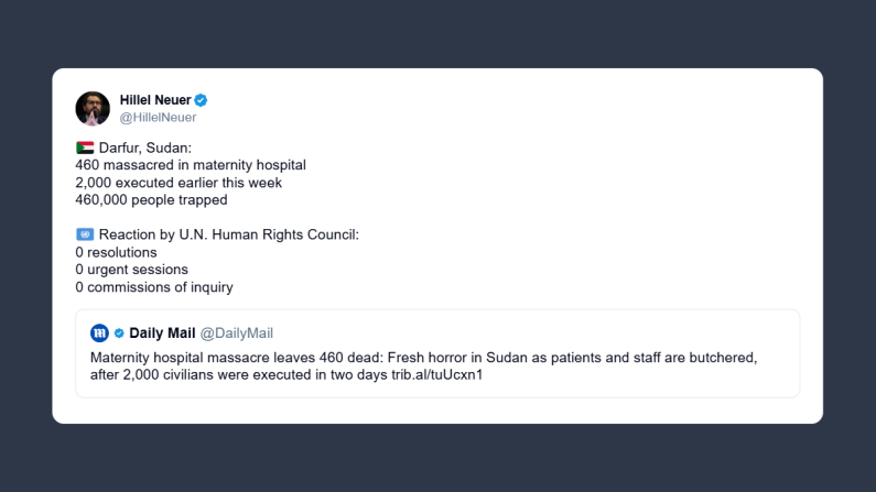 Hillel Neuer, avvocato internazionale specializzato in diritti umani, ha scritto ieri su X: «Darfur, Sudan: 460 massacrati in un ospedale di maternità; 2 mila giustiziati all’inizio della settimana e