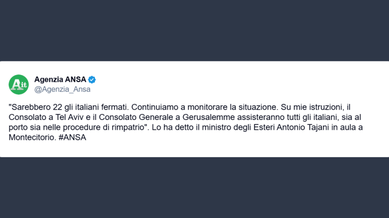 «Sarebbero 22 gli italiani fermati. Continuiamo a monitorare la situazione. Su mie istruzioni, il Consolato a Tel Aviv e il Consolato Generale a Gerusalemme assisteranno tutti gli italiani, sia al porto sia nelle procedure di rimpatrio». Lo ha dichiarato, come riportato da Ansa su X, il ministro degli Esteri Antonio Tajani in aula a Montecitorio.