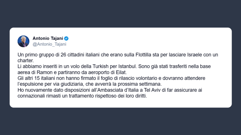 Il ministro degli esteri Antonio Tajani, su X rassicura sulla sorte degli italiani facenti parte della Flotilla: «Un primo gruppo di 26 cittadini italiani che erano sulla Flotilla sta per lasciare Israele con un charter. Li abbiamo inseriti in un volo della Turkish per Istanbul. Sono già stati trasferiti nella base aerea di Ramon e partiranno da aeroporto di Eilat».