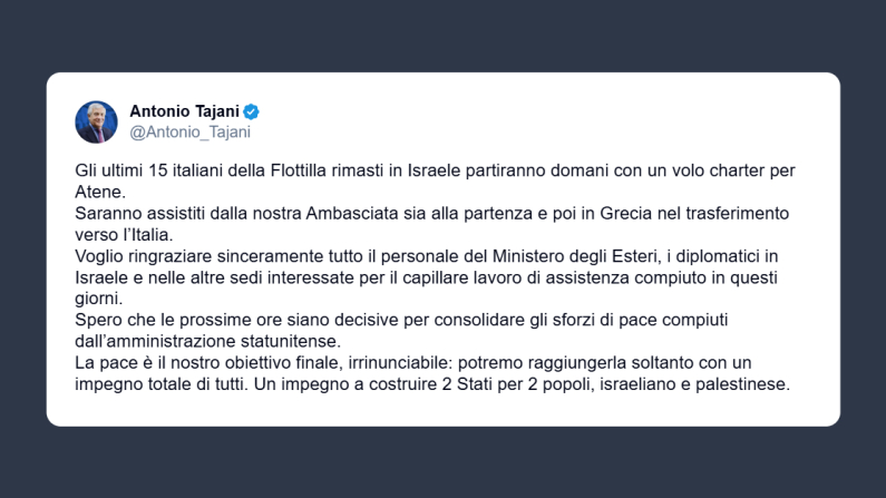 «Gli ultimi 15 italiani della Flottilla rimasti in Israele partiranno domani con un volo charter per Atene. Saranno assistiti dalla nostra Ambasciata sia alla partenza e poi in Grecia nel trasferimento verso l’Italia». Lo ha dichiarato ieri su X il ministro degli Esteri, Antonio Tajani. Per il ministro le prossime ore potranno «essere decisive per consolidare gli sforzi di pace compiuti dall’amministrazione statunitense». La pace è «il nostro obiettivo finale, irrinunciabile: potremo raggiungerla soltanto con un impegno totale di tutti. Un impegno a costruire 2 Stati per 2 popoli, israeliano e palestinese», ha concluso Tajani.