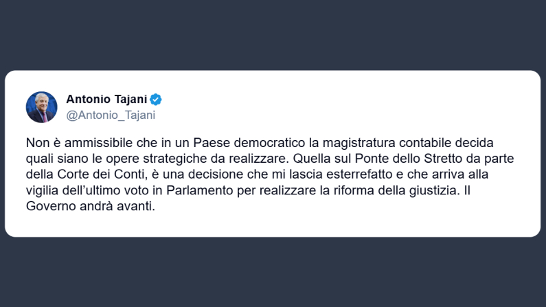 «Non è ammissibile che in un Paese democratico la magistratura contabile decida quali siano le opere strategiche da realizzare. Quella sul Ponte dello Stretto da parte della Corte dei Conti, è una decisione che mi lascia esterrefatto e che arriva alla vigilia dell’ultimo voto in Parlamento per realizzare la riforma della giustizia. Il Governo andrà avanti».