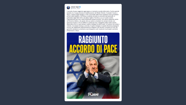Il ministro degli Esteri, Antonio Tajani, ha così commentato su X la pace fra Hamas e Israele: