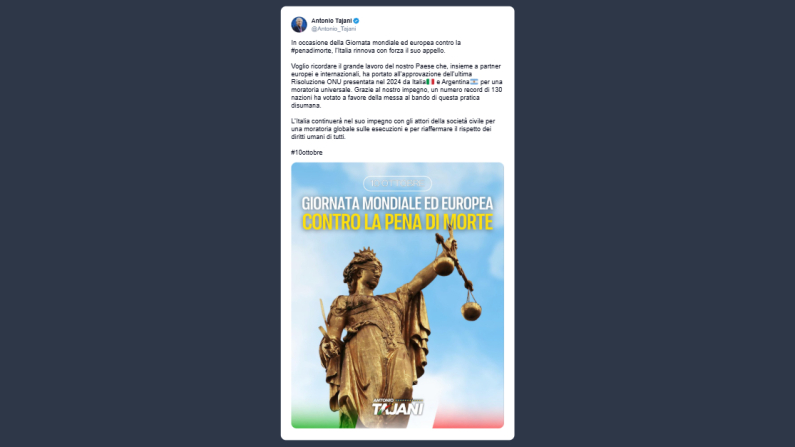Il ministro degli Esteri, Antonio Tajani, ha scritto su X: «In occasione della Giornata mondiale ed europea contro la pena di morte, l’Italia rinnova con forza il suo appello. Voglio ricordare il grande lavoro del nostro Paese che, insieme a partner europei e internazionali, ha portato all’approvazione dell’ultima Risoluzione Onu presentata nel 2024 da Italia e Argentina per una moratoria universale. Grazie al nostro impegno, un numero record di 130 nazioni ha votato a favore della messa al bando di questa pratica disumana». L’Italia continuerà, conclude Tajani, nel suo «impegno con gli attori della società civile per una moratoria globale sulle esecuzioni e per riaffermare il rispetto dei diritti umani di tutti».