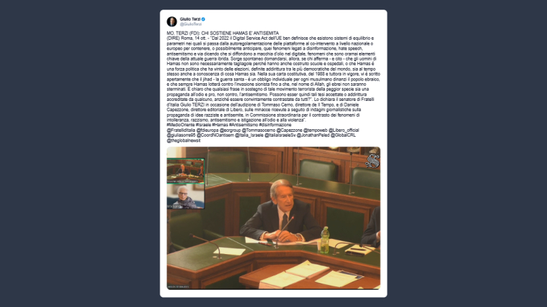 Il senatore Giulio Terzi ha dichiarato ieri su X che «dal 2022 il Digital Service Act dell’Ue [normativa che mira a creare un ambiente online sicuro tutelando i diritti degli utenti e contrastando i contenuti illegali e la disinformazione ndr] ben definisce che esistono sistemi di equilibrio e parametri nei quali si passa dalla autoregolamentazione delle piattaforme al co-intervento a livello nazionale o europeo per contenere, o possibilmente anticipare, quei fenomeni legati a disinformazione, hate speech, antisemitismo e via dicendo che si diffondono a macchia d’olio nel digitale, fenomeni che sono oramai elementi chiave della attuale guerra ibrida». Sorge spontaneo domandarsi, prosegue Terzi, se chi afferma che gli «uomini di Hamas non sono necessariamente tagliagole perché hanno anche costruito scuole e ospedali, o che Hamas è una forza politica che ha vinto delle elezioni, definite addirittura tra le più democratiche del mondo, sia al tempo stesso anche a conoscenza di cosa Hamas sia».