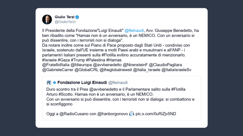 Il senatore Giulio Terzi ha dichiarato ieri su X: «Il Presidente della Fondazione Luigi Einaudi, Giuseppe Benedetto, ha ribadito come Hamas non è un avversario, ma un nemico. Con un avversario si può dissentire, con i terroristi non si dialoga». Da notare inoltre, precisa Terzi, come sul «Piano di Pace proposto dagli Stati Uniti – condiviso con Israele, sostenuto dall’Ue insieme a molti Paesi arabi e musulmani e all’Anp – i parlamentari italiani presenti sulla Flotilla evitino accuratamente di menzionarlo».