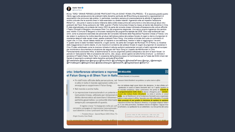 Il senatore di Fratelli d’Italia, Giulio Terzi, ha riportato su X un articolo sulla persecuzione del Falun gong: