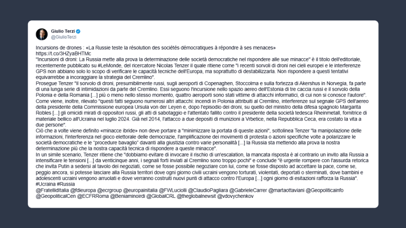 Il senatore Giulio Terzi ha riportato ieri su X il titolo dell’editoriale pubblicato da Le Monde: «Incursioni di droni: La Russia mette alla prova la determinazione delle società democratiche nel rispondere alle sue minacce». Il ricercatore Nicolas Tenzer, spiega Terzi, ritiene che «i recenti sorvoli di droni nei cieli europei e le interferenze non abbiano solo lo scopo di verificare le capacità tecniche dell’Europa, ma soprattutto di destabilizzarla».