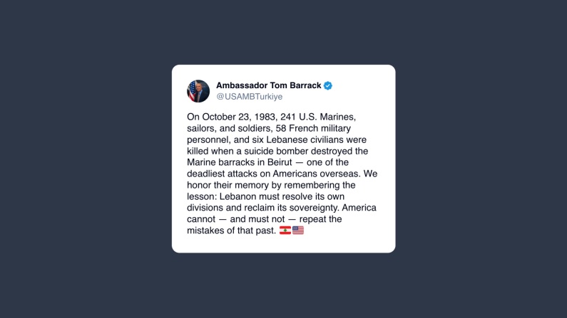 In un messaggio pubblicato sul suo account ufficiale su X, Barrack ha ricordato che «il 23 ottobre 1983 un attentatore suicida fece esplodere un camion bomba contro la base dei marines statunitensi nella capitale libanese, uccidendo 241 tra marines, marinai e soldati americani, 58 militari francesi e sei civili libanesi».