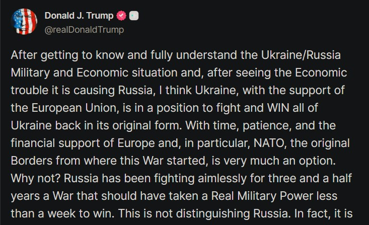 Osservando le «difficoltà economiche che l’Ucraina sta causando alla Russia, ritengo che Kiev, con il sostegno dell’Ue, sia in grado di riconquistare integralmente il proprio territorio». Lo ha dichiarato ieri su Truth il presidente degli Stati Uniti, Donald Trump. La Russia, ha detto il presidente, combatte da tre anni e mezzo una guerra che «non va da nessuna parte» e che una vera potenza militare avrebbe vinto in «meno di una settimana», cosa che farebbe apparire Mosca come una «tigre di carta». Ma quando gli abitanti russi – ha proseguito Trump – comprenderanno la reale situazione, vedranno che la maggior parte delle risorse è stata spesa per combattere l’Ucraina e faranno la fila anche solo per «fare benzina». A quel punto l’Ucraina potrà «riprendersi il proprio territorio». La Russia di Putin versa «in gravi difficoltà economiche, ed è questo il momento per l’Ucraina di agire. Continueremo a fornire armi alla Nato, affinché l’Alleanza le utilizzi come ritiene opportuno».