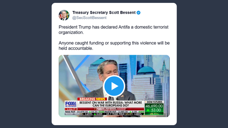 Il ministro del Tesoro degli Stati Uniti, Scott Bessent, ha riportato su X la recente dichiarazione del presidente, Donald Trump: «Antifa è un’organizzazione terroristica interna. Chiunque venga sorpreso a finanziare o sostenere queste violenze sarà ritenuto responsabile».