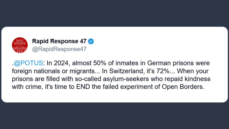 La Casa Bianca ha riportato ieri su X il discorso all’Assemblea generale dell’Onu del presidente degli Stati Uniti, in merito alla (sempre più preoccupante) situazione dell’immigrazione irregolare in Europa. «Nel 2024, quasi il 50% dei detenuti nelle carceri tedesche erano stranieri o migranti. In Svizzera, la percentuale è del 72%. Quando le prigioni si riempiono di presunti richiedenti asilo che ripagano la generosità dello Stato con i crimini, è il momento di porre fine al fallimentare esperimento delle frontiere aperte». Secondo un comunicato ufficiale del ministero della Giustizia aggiornato al 31 agosto 2025, in Italia su 63 mila 167 detenuti 20 mila 111 sono stranieri: il 31,84%.